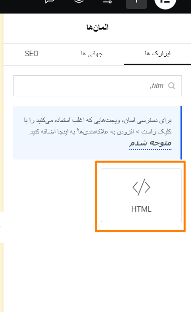 - از المنتور، ویجت HTML رو انتخاب کن و به صفحه درگ کن. 🖱️