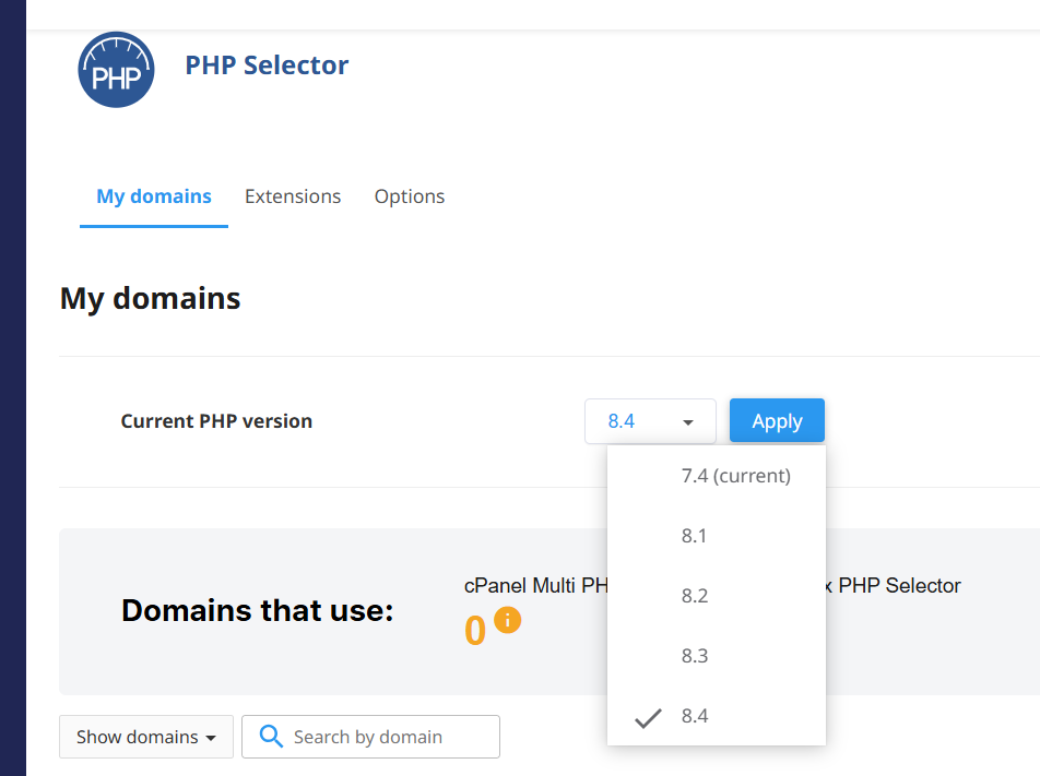 بعد از اینکه روی گزینه Select PHP Version کلیک کردی، یه صفحه برات باز میشه که توش یه منوی کشویی میبینی 😄 از همونجا میتونی نسخه دلخواه PHPت رو از بین گزینههایی مثل 7.4 یا 8.2 یا حتی جدیدتر، انتخاب کنی 🙂