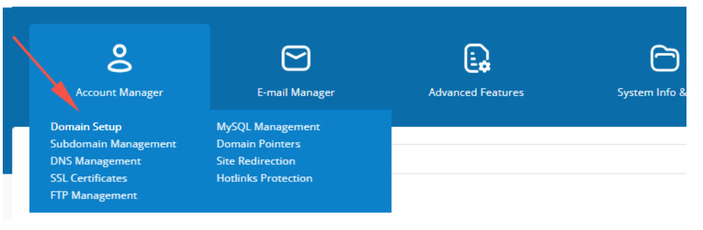 وقتی وارد دایرکت ادمین شدی، از منوی سمت چپ یا بالا، روی Account Manager کلیک کن. سپس وارد بخش Domain Setup بشو.
