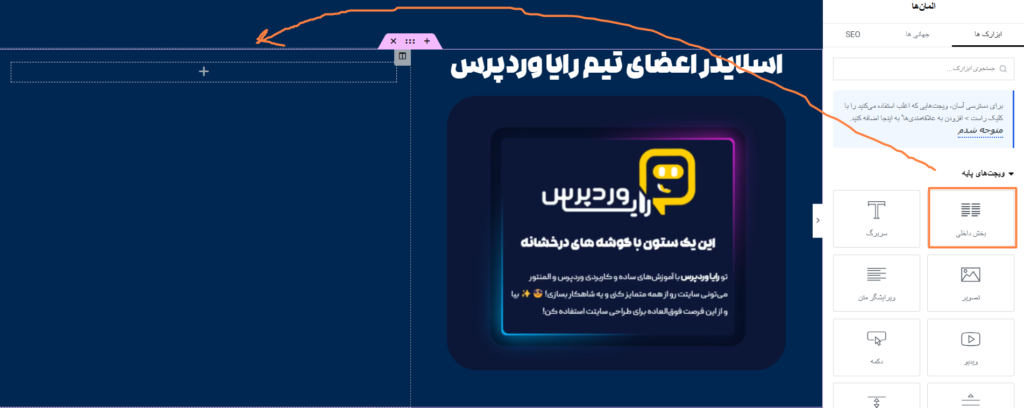 1️⃣اول از همه، از قسمت سمت راست پنل المنتور، ویجت بخش داخلی رو میکشم و توی ستون سمت چپ برگه المنتور رها میکنم.