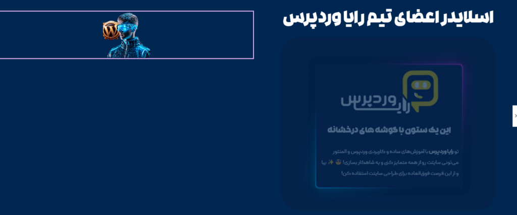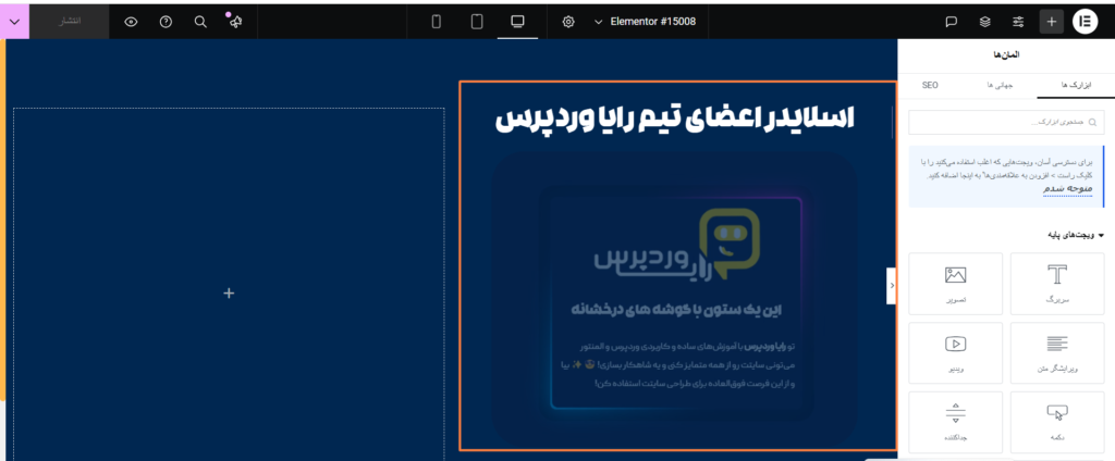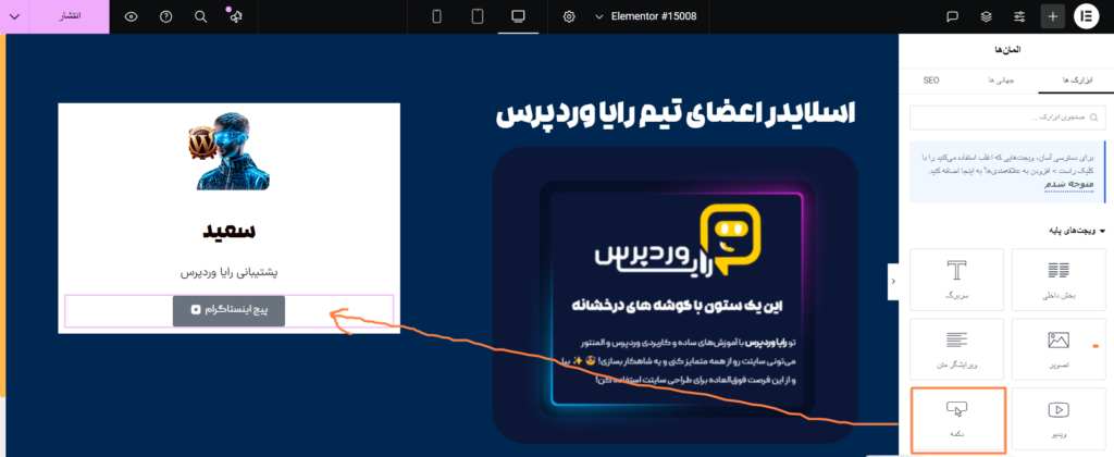 - طراحی ستون سمت چپ (ستون شامل اسلایدر عمودی): خب، حالا میرسیم به اصل داستان! 😎 یعنی طراحی اسلایدر عمودی. من قراره این اسلایدر رو برای نمایش اعضای تیم رایا وردپرس به همراه پیچ اینستاگرام هر کدومشون طراحی کنم. برای این کار، به چندتا المان نیاز دارم: اول از همه یه ویجت تصویر برای نمایش عکسها، یه ویجت سربرگ و متن برای توضیحات کوتاه، و در نهایت یه ویجت دکمه برای هدایت کاربرها به پیچ اینستاگرام هرکدوم از اعضا. 🔥