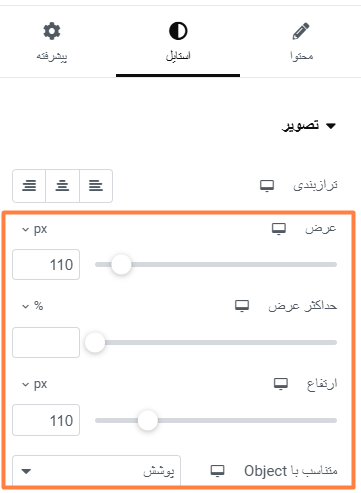 حالا میرم به تب استایل ویجت تصویر و طول و عرض رو روی 110 پیکسل تنظیم میکنم. بعد از اون، گزینه Object Fit رو روی حالت Cover قرار میدم تا تصویر به طور کامل و با بهترین حالت ممکن در فضای اختصاصی خودش جا بشه. 📏✨