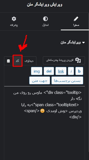 در گام دوم ، باید استایلهای CSS تولتیپت رو اضافه کنی. برای این کار به تب «پیشرفته» در ویجت ویرایشگر متن برو و کدهای زیر رو در بخش «CSS سفارشی» پیست کن:
