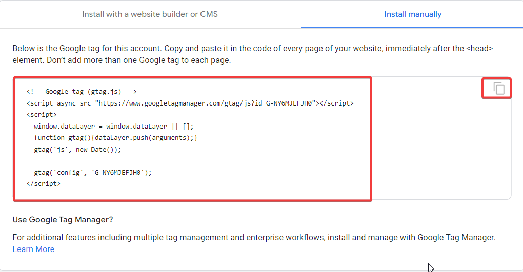 روی بخش Install manually بزن و کد گوگل تگ رو کپی کن. هنوز کار تموم نشده حالا که کد ردیابی گوگل آنالیتیکس رو دریافت کنی باید به سایت وردپرسی ات اضافه کنی برای اینکار طبق مراحل زیر پیش برو: