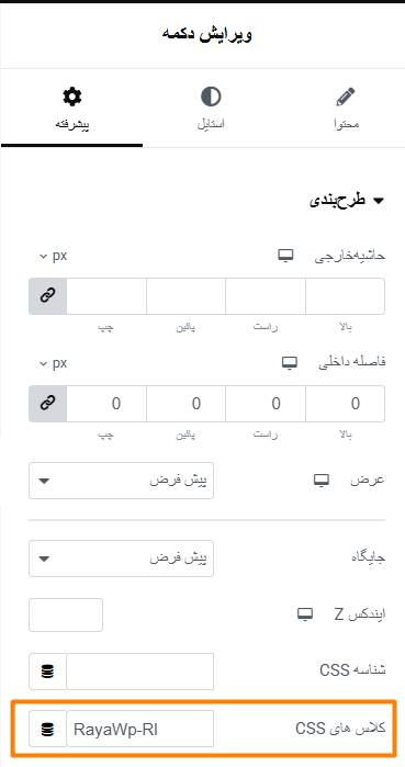 حالا که کد رو اضافه کردی، یه کار دیگه هم باید بکنی تا افکت به درستی اعمال بشه. باید بری به تب پیشرفته و تو قسمت کلاسهای CSS، کلاس RayaWp-Rl رو به دکمهت اختصاص بدی. 😎