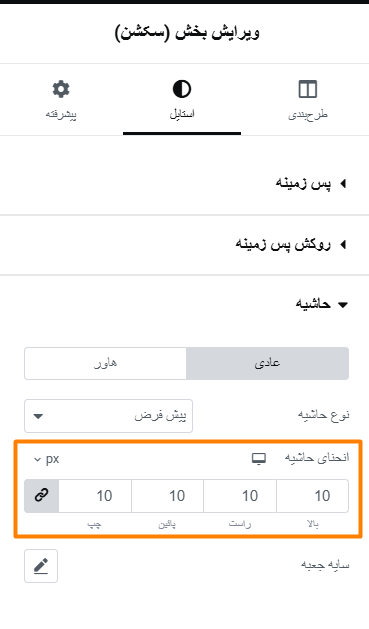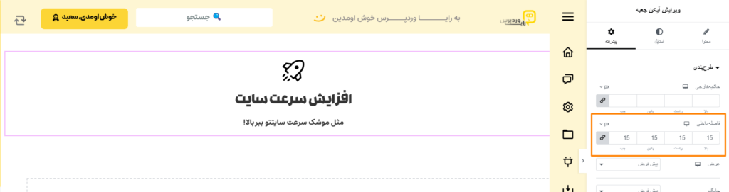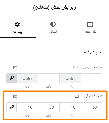 حالا به تب پیشرفته برو و مثل عکس زیر، به سکشن پدینگ داخلی اضافه کن. این کار باعث میشه فاصلهها منظمتر و بهتر بشن و ظاهر کلی بخش جذابتر بشه! 📐✨
