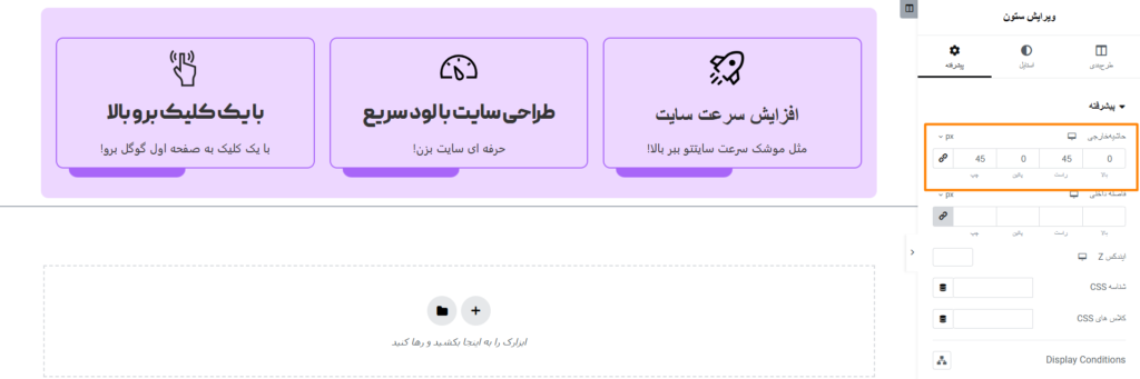 حالا روی ستون اصلی که شامل سه ستون دستهبندی میشه کلیک کن تا پنل ویرایش برات باز بشه. بعد یه مارجین یا فاصله خارجی بهش بده تا از گوشههای صفحه فاصله مناسبی بگیره و ظاهر بهتری پیدا کنه! ✨