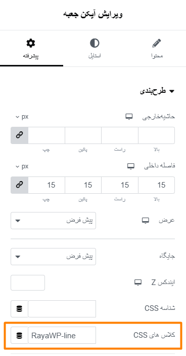کد زیر رو در بخش “تب پیشرفته” و “کد CSS سفارشی” ویجت آیکون باکس قرار بده. بعد از طریق همین تب پیشرفته، در بخش “کلاسهای CSS”، کلاس RayaWP-line رو به ویجت آیکون باکس اختصاص بده:
