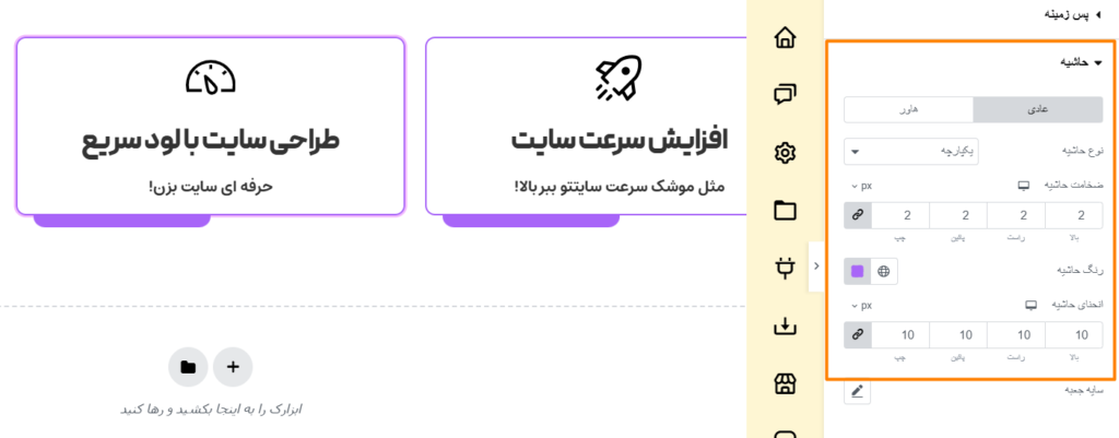 برای اینکه کار تمیزتر و حرفهایتر به نظر بیاد، بهتره یه حاشیه یکپارچه با رنگ بنفش (A865F8#) به باکسها بدی. 😎 اینطوری باکسها گوشههای گرد و نرمتری پیدا میکنن. برای اینکار روی هر آیکون باکس کلیک کن تا پنل ویرایش باز بشه. حالا به تب پیشرفته برو و از قسمت حاشیه، یه حاشیه یکپارچه با ضخامت 2 پیکسل تنظیم کن. سپس انحنای حاشیه رو به 10 پیکسل تغییر بده تا گوشهها نرم و گرد بشن. اینطوری ظاهر باکسها خیلی شیک و حرفهایتر میشه! ✨