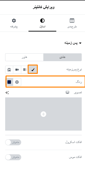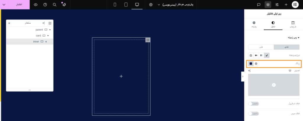 - حالا به تب استایل کانتینر ‘inner’ برو و نوع پسزمینه رو روی کلاسیک تنظیم کن. سپس رنگش رو به کد رنگ (#091742) تغییر بده.