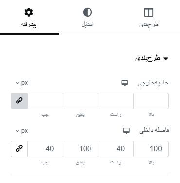 - به تب پیشرفته برو و پدینگ داخلی کانتینر را به صورت زیر تنظیم کن: 100 پیکسل برای بالا و پایین و 40 پیکسل برای چپ و راست.