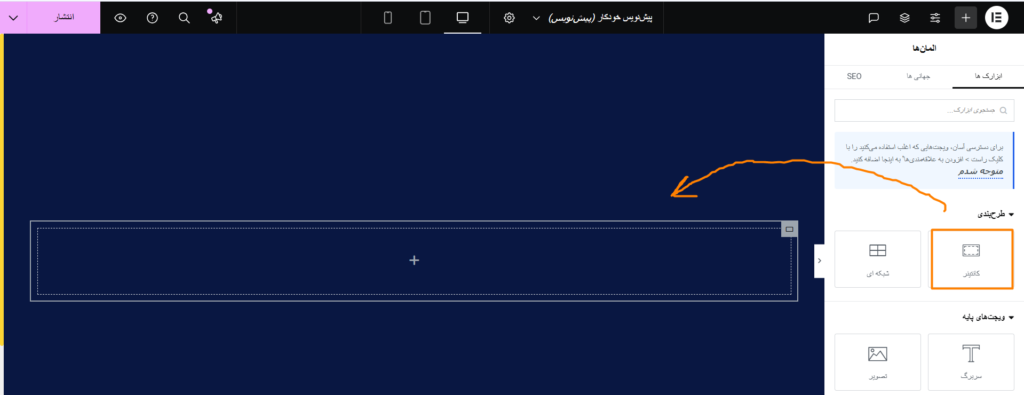 - در قدم بعدی، از پنل ابزارک های المنتور، طرحبندی کانتینر رو پیدا و اونو به داخل کانتینر اصلی اضافه کن.