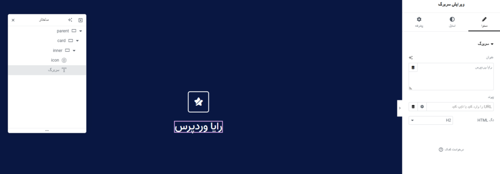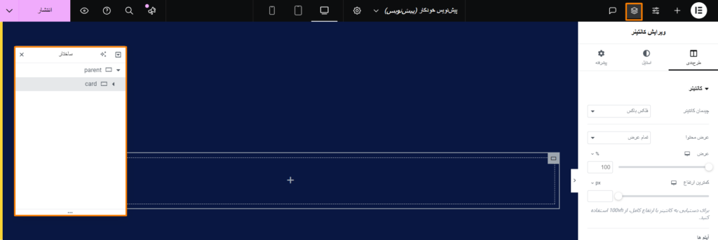 - برای اینکه اسامی کانتینرها منحصر به فرد باشه و دچار اشتباه نشی، بهتره از نوار مشکی بالای ویرایشگر المنتور روی آیکون منوی ناوبری یا ساختار کلیک کنی تا منوی شناوری نمایش داده بشه. سپس روی عناوین بخشها دابلکلیک کن و نام ‘parent’ رو به کانتینر اصلی و ‘card’ رو به کانتینر داخلی اختصاص بده.