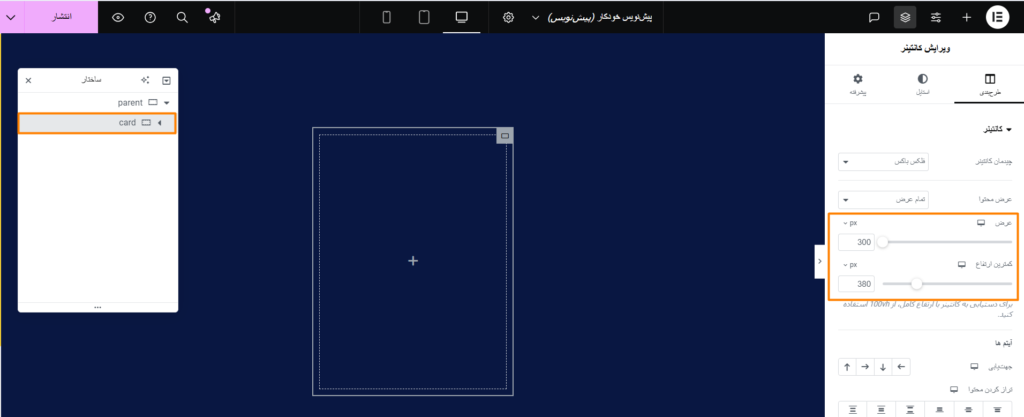 - حالا از منوی ناوبری روی کانتینری با نام ‘card’ کلیک کن تا تنظیمات آن در ستون سمت راست صفحه نمایش داده بشه. سپس عرضش رو 300 پیکسل و ارتفاعش رو هم 380 پیکسل تنظیم کن.
