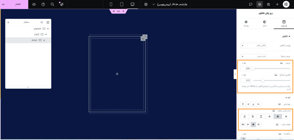 - از منوی ناوبری روی کانتینر ‘inner’ کلیک کن تا تنظیمات اون برات نمایش داده بشه. سپس عرض کانتینر رو روی 295 پیکسل و حداقل ارتفاعش رو 375 پیکسل تنظیم کن. همچنین تراز بندی محتوا رو هم وسط چین انتخاب کن.