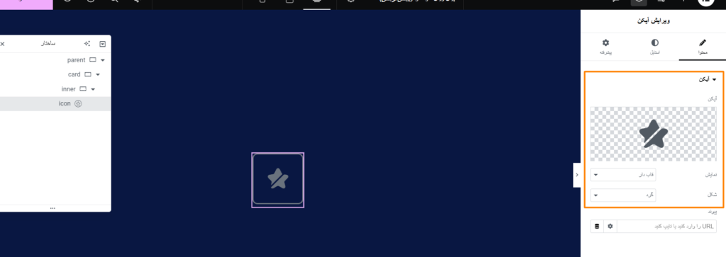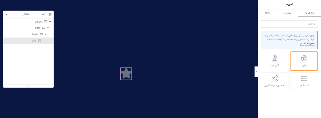 - حالا وقتشه ویجتهای موردنظر رو به داخل کانتینر ‘inner’ اضافه کنی. اولین ویجتی که باید اضافه کنی، ویجت ‘Icon’ هست. ویجت ‘Icon’ رو در پنل ابزارکهای المنتور جستجو کن و به داخل کانتینر ‘inner’ بکش.