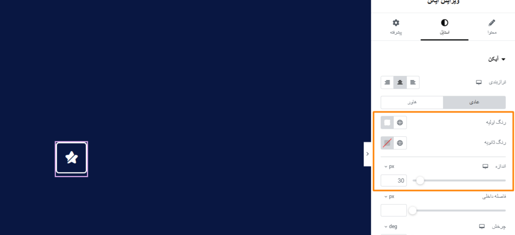 - به تب استایل برو و رنگ اولیه آیکون رو سفید و اندازه آیکون رو 30 پیکسل در نظر بگیر.