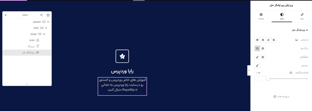 - بعد از اضافه کردن ویجت ویرایشگر متن، متن دلخواهت رو به جای متن پیش فرض ویجت جایگزین کن به تب استایل برو و این قسمتو طبق سلیقه خودت تکمیلش کن و رنگ متن رو رنگ روشن مثل (#A69F9F) قرار بده.