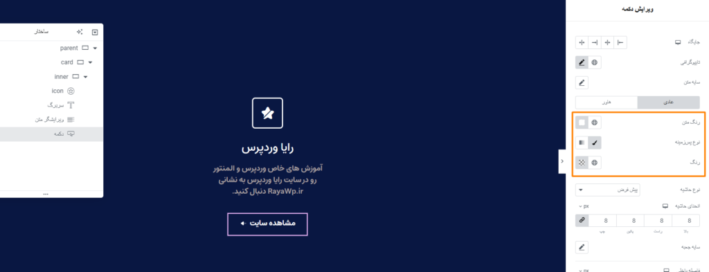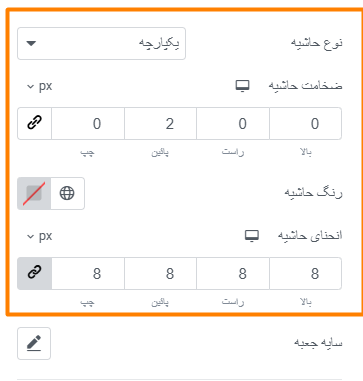 - برای بهتر شدن استایل دکمه، از همان تب استایل انحنای حاشیه (border-radius) را روی 8 پیکسل تنظیم کن و نوع حاشیه رو یکپارچه قرار بده. همچنین حاشیه پایین رو 2 پیکسل در نظر بگیر.