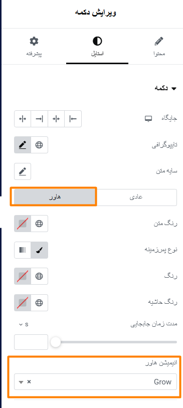- از همون تب استایل، در بخش هاور، افکت Grow رو برای دکمهات انتخاب کن. اینطوری وقتی ماوس روی دکمه میره، یه انیمیشن قشنگ نشون داده میشه.