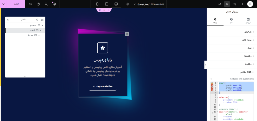 - خب، طرح ما کامل شد و حالا میرسیم به بخش جذاب کار، یعنی اضافه کردن کد CSS برای دادن یک حالت درخشان و جذاب به کارتمون. برای این کار، از منوی ناوبری روی کانتینر ‘card’ کلیک کن، سپس به تب پیشرفته برو و در بخش CSS سفارشی، کدهای زیر را وارد کن: