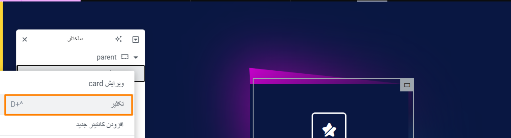 - اگه بخوای چندین کارت داشته باشی، نیازی به طراحی مجدد نیست. کافیه از منوی ناوبری روی کانتینر ‘card’ کلیک کنی و گزینه داپلیکیت یا تکثیر رو بزنی تا کارتها کپی بشن. بعدش جزئیات هر کارت مانند آیکون، متن عنوان، توضیحات و دکمه را به طور جداگانه تنظیم کنی 🙂