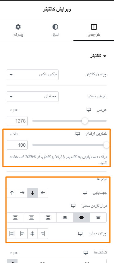- به تنظیمات کانتینر برو، ارتفاع آن را روی 100vh تنظیم کن و تراز محتوا را روی وسط چین قرار بده تا محتوا به طور کامل در وسط صفحه نمایش داده بشه.