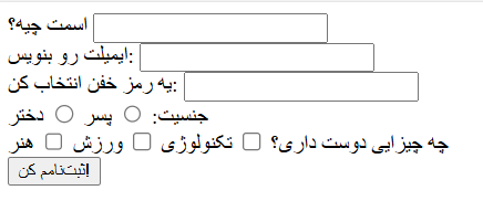 - دکمه ارسال فرم: این دکمه برای ارسال اطلاعات فرم به سرور استفاده میشه.