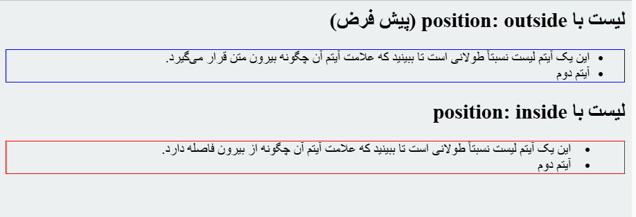 - list-style-position : موقعیت قرار گیری آیتم ها