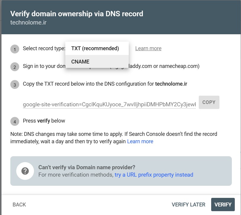- روش تایید با رکورد TXT (پیشنهادی گوگل 😉)