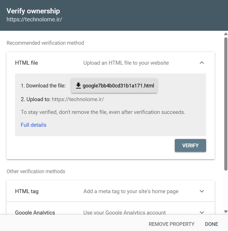 در این روش فایل HTML ای که گوگل در اختیارت میزاره رو دانلود کن و در پوشه public_html هاست خودت آپلود کن. پس از انجام اینکار روی VERIFY کلیک کن تا دامنه ات وریفای (تایید) بشه.