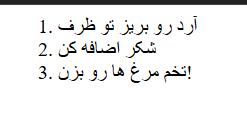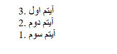 1→ (۱, ۲, ۳, …) پیشفرضA→ (A, B, C, …) حروف بزرگ انگلیسیa→ (a, b, c, …) حروف کوچک انگلیسیI→ (I, II, III, …) اعداد رومی بزرگi→ (i, ii, iii, …) اعداد رومی کوچک