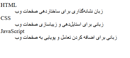 <dl>: مشخص میکنه که این یه لیست توضیحیه.<dt>(Define Term): عنوان یا اصطلاحی که قراره براش توضیح نوشته بشه.<dd>(Description Definition): توضیح مربوط به اون عنوان.