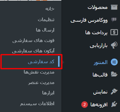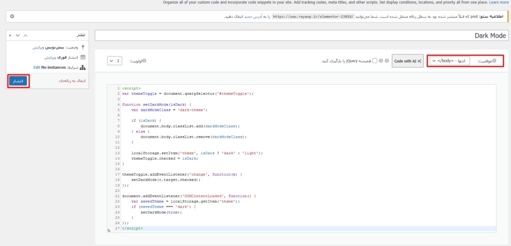 برای افزودن کد بالا در المنتور، به پیشخوان برو، روی المنتور در منوی سمت راست کلیک کن، سپس در قسمت کد سفارشی یک عنوان دلخواه برای اسکریپت بنویس (مثلاً Dark Mode). حالا کدهای بالا رو وارد کن و موقعیتش رو در انتها (تگ بسته body) قرار بده. بعد روی دکمه انتشار بزن، در پنجره باز شده کل سایت رو انتخاب کن و تغییرات رو ذخیره کن. 🌟