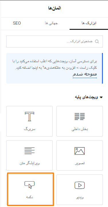 اولین قدم اینه که وارد صفحهساز المنتور بشی و ویجت دکمه رو به صفحهات اضافه کنی. برای اسم دکمه، یه عنوان جذاب و مرتبط انتخاب کن؛ مثل “کلیک کن” یا “ثبتنام” که هم کاربر رو ترغیب کنه، هم کاربرد دکمه رو مشخص کنه.