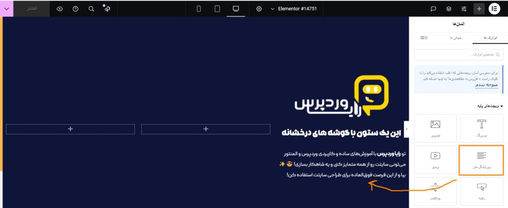 برای افزودن ویرایشگر متن به ستون، ابتدا باید ویجت ویرایشگر متن رو از پنل سمت راست پیدا کنی. برای این کار، در نوار جستجو در بالای پنل، کلمه “ویرایشگر متن” یا “Text Editor” رو تایپ کن. بعد از اینکه ویجت رو پیدا کردی، کافیه اون رو بگیری و داخل ستون درست زیر ویجت سربرگ رها کنی.
