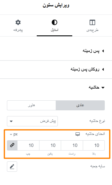 تو همین بخش ویرایش ستون، به تب استایل برو و از قسمت حاشیه، انحنای حاشیه رو روی 10 پیکسل تنظیم کن.