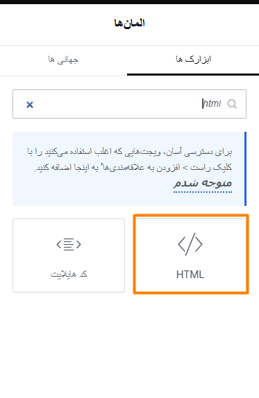 - ویجت HTML رو از قسمت ابزارکها پیدا کن، بکش و داخل برگه رها کن (Drag & Drop)