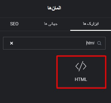 صفحهای که میخوای باکس رو بهش اضافه کنی توی المنتور باز کن. حالا از قسمت ویجتها، ویجت HTML رو پیدا کن و بکش بذار توی هر قسمتی از صفحه که دلت میخواد “باکس تبلیغاتی” ات نمایش داده بشه.
