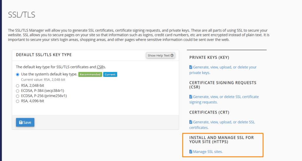 خیلی از هاستینگها بهصورت رایگان گواهینامه SSL Let’s Encrypt رو ارائه میدن. برای نصب گواهینامه SSL رایگان Let’s Encrypt در cPanel، کافیه در صفحه SSL/TLS از قسمت سمت راست و بخش Install and Manage SSL for your site (HTTPS) روی گزینه Manage SSL sites کلیک کنی.