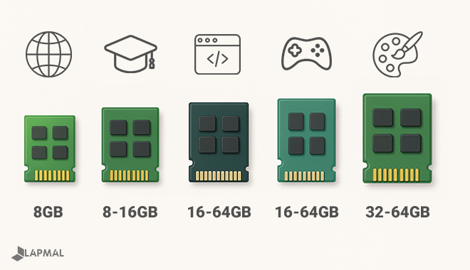 به همین دلیل می توان گفت که یک رم لپ تاپ 8 گیگابایتی (نوع DDR4 با حداقل فرکانس 2400 مگاهرتز یا نوع DDR5 با حداقل فرکانس 4800 مگاهرتز) نیازهای اساسی این گروه از کاربران را مرتفع می کند.
