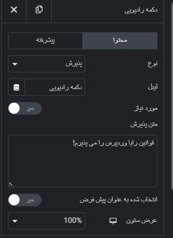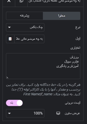 - وقتی فرمت رو اضافه کردی از تب محتوا دو تا فیلد آیتم جدید به فرمت اضافه کن یکیش دکمه رادیویی باشه و دیگری چک باکس.