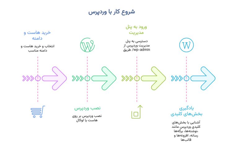 | گامهای اولیه برای کار با وردپرس | ۱. خرید هاست و دامنه مناسب. ۲. نصب وردپرس بر روی هاست یا لوکال. ۳. ورود به /wp-admin. ۴. یادگیری بخشهای کلیدی: نوشتهها، برگهها، رسانه، افزونهها و قالبها. | یادگیری ساختار وردپرس پایهایترین قدم برای مدیریت سایت است. |