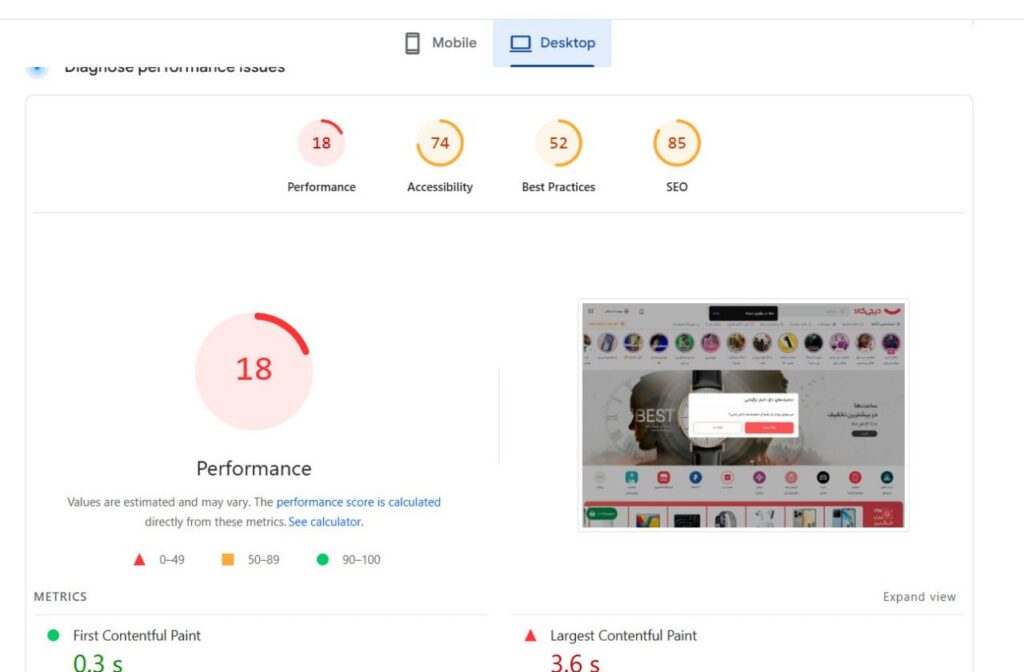 برای همین مثلاً سایت بزرگی مثل #دیجی_کالا رو اگه مثل من تست سرعت بگیرین (عکس پایین) با این ابزارا میبینین که نمره پرفورمنس اصلن خوبی نمیگیره ولی چون توی عمل کاربرای زیادی راحت ازش استفاده میکنن، گوگل هم اونو سایت استاندارد و سریعی میدونه.