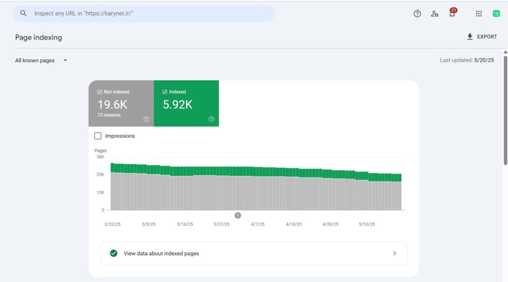 Indexed (ایندکس شده): این عدد یعنی 5.92 هزار صفحه از سایت به درستی ایندکس شدن و میتونن تو نتایج گوگل ظاهر بشن. هدف ما اینه که این عدد رو تا جای ممکن افزایش بدیم!