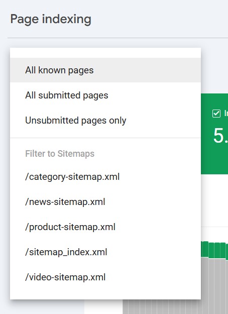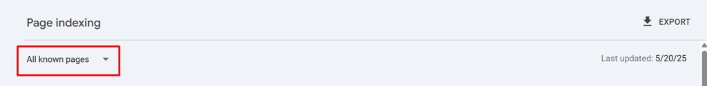 All known pages (تمام صفحات شناخته شده): این فیلتر که در تصویر هم انتخاب شده، نشون میده که گوگل کلاً چند تا صفحه از سایتت رو کشف کرده، چه اونایی که خودت معرفی کردی و چه اونایی که خودش از طریق لینکهای داخلی یا خارجی پیدا کرده.