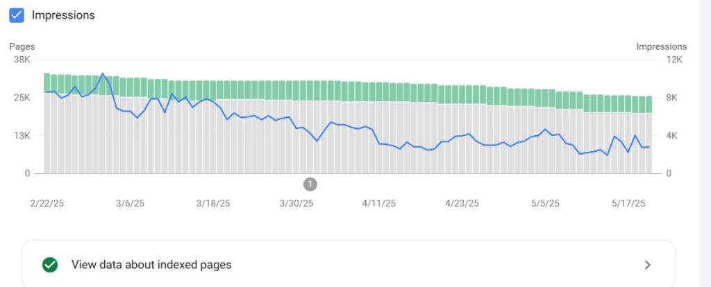 نمودار Page Indexing: همونطور که در تصویر بالا میبینی، نمودار، روند ایندکس شدن و نشدن صفحاتت رو در طول زمان نشون میده. خط سبز رنگ (Indexed) صفحاتی هستن که ایندکس شدن و خط خاکستری رنگ (Not Indexed) صفحاتی هستن که ایندکس نشدن. با بررسی این نمودار، میتونی بفهمی که آیا روند ایندکس شدن صفحاتت صعودیه یا نزولی، و آیا اقداماتت برای بهبود ایندکسینگ نتیجه داده یا نه. این نمودار به وضوح نشون میده که تعداد صفحات Not Indexed (خط خاکستری) از Indexed (خط سبز) بیشتره و یک روند نزولی در صفحات Indexed دیده میشه.